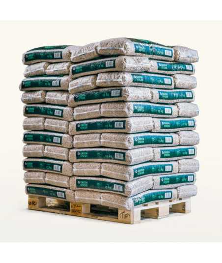 Die ENplus A1 Holzpellets der Marke greensticks werden in 15kg Säcken abgepackt. Auf einer Einwegpalette befinden sich 66 Säcke mit einem Gesamtgewicht von 990kg. Unsere greensticks Pellets (⌀ 6mm )verfügen über eine ENplus A1 Zertifizierung und übertreffen sogar den hierdurch vorgegebenen Heizwert: